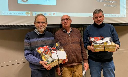 Medebestuurder Fred Bisschop bedankte Maarten en Ron tijdens de clubavond op 21 maart 2024 voor hun geweldige inzet voor de club en overhandigde ze onder luid applaus van de aanwezigen, een mooi lokaal pakket, mede gesponsord door Prinselijk Proeven.